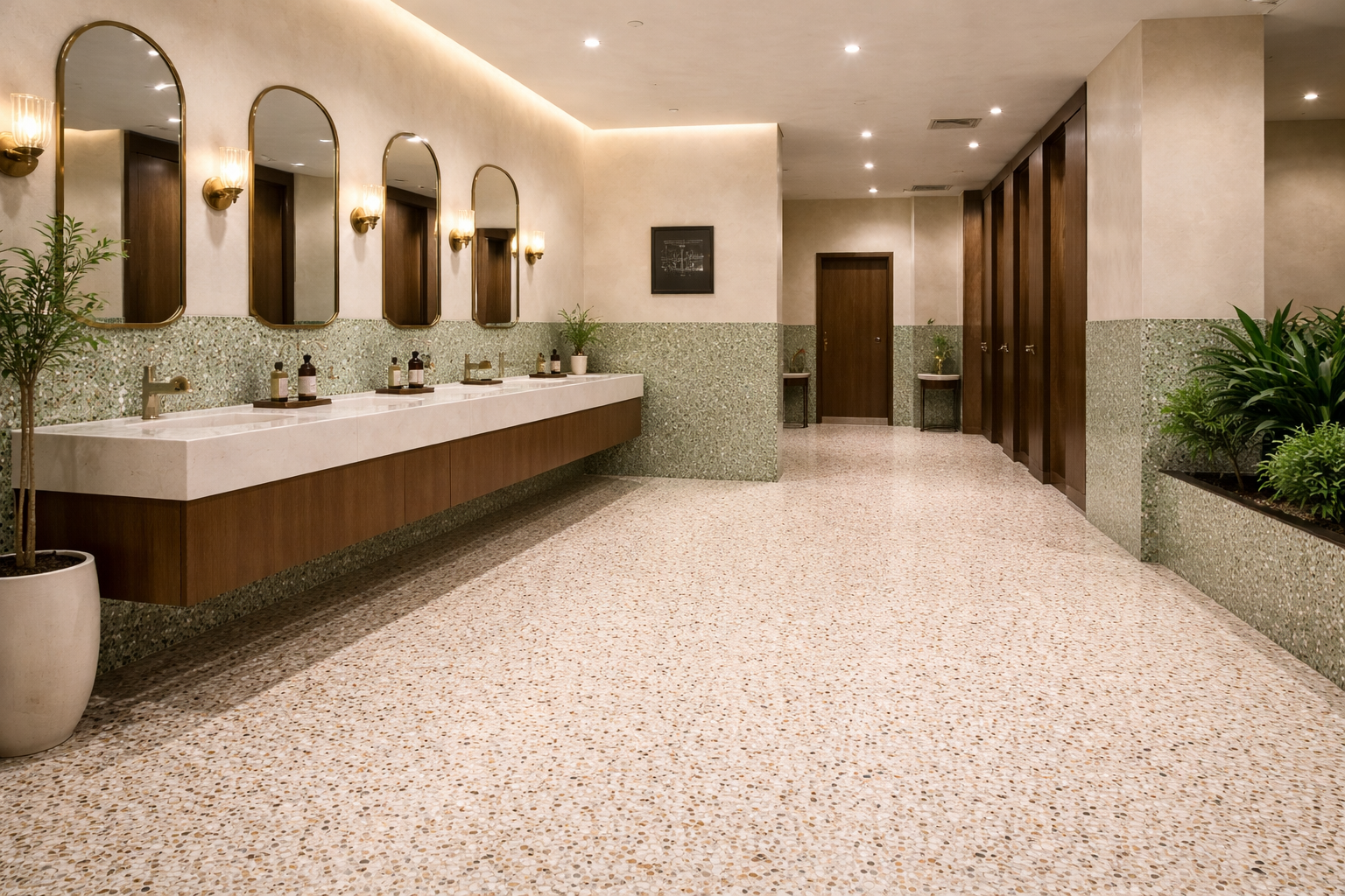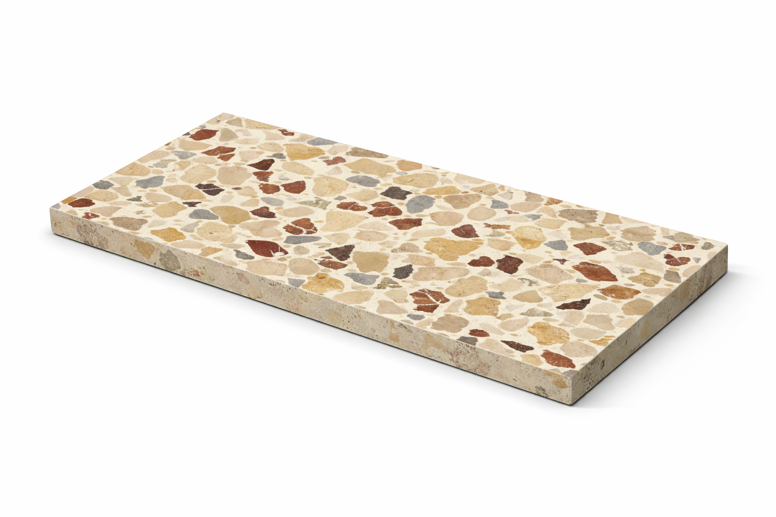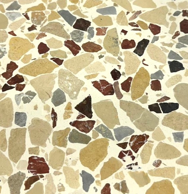 Odessa is a vibrant terrazzo paver featuring a light cream cement base combined with a diverse mix of warm and cool stone aggregates. Fragments of sandy beige, soft grey, deep red, and charcoal create a lively mosaic that gives the surface a distinctive architectural character.